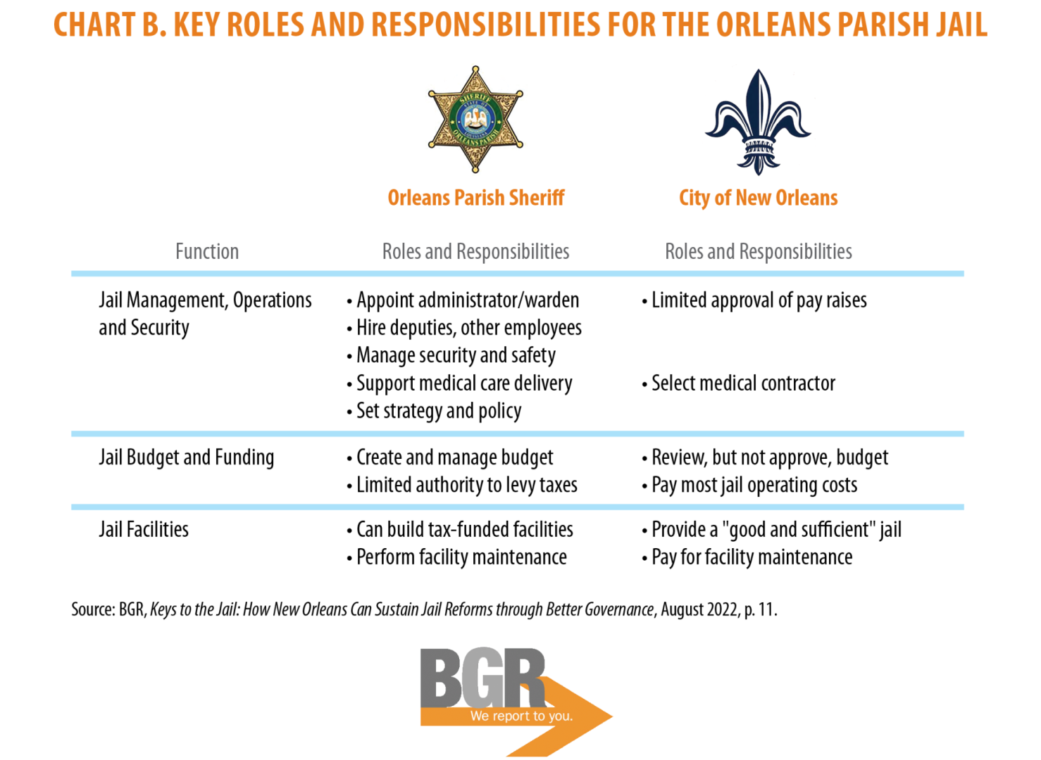 BGR’s 2022 report, Keys to the Jail, linked the jail’s performance problems to the strained governance relationship between the Orleans Parish Sheriff’s Office and the City. Under Louisiana law, the Sheriff’s Office operates the jail, while the City must pay most of its costs – 79% of its $91.1 million total budget in 2025. This structure has blurred accountability for the jail’s performance and impeded progress toward improving its performance and exiting federal oversight. BGR recommended the City and Sheriff’s Office develop a multi-year agreement to: