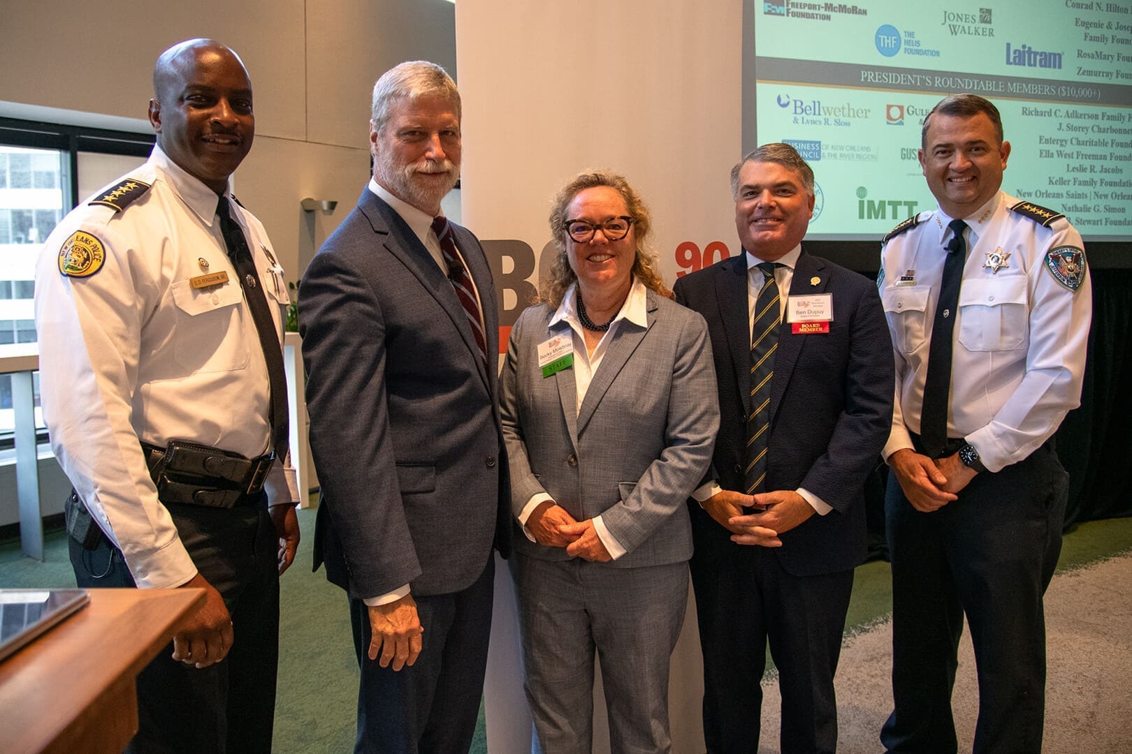 Today, the Bureau of Governmental Research (BGR) presented its first in-person Breakfast Briefing in more than two years. The event, made free to the public by First Horizon Bank and held in downtown New Orleans, featured New Orleans Superintendent of Police Shaun D. Ferguson and Jefferson Parish Sheriff Joseph P. Lopinto III. Our moderator for the panel discussion was Jim Letten, partner at Butler Snow LLP and former U.S. Attorney for the Eastern District of Louisiana. The event marked the third installment in BGR’s special Breakfast Briefing series on public safety.