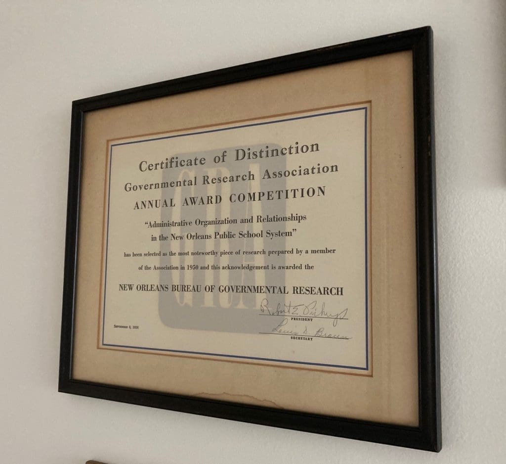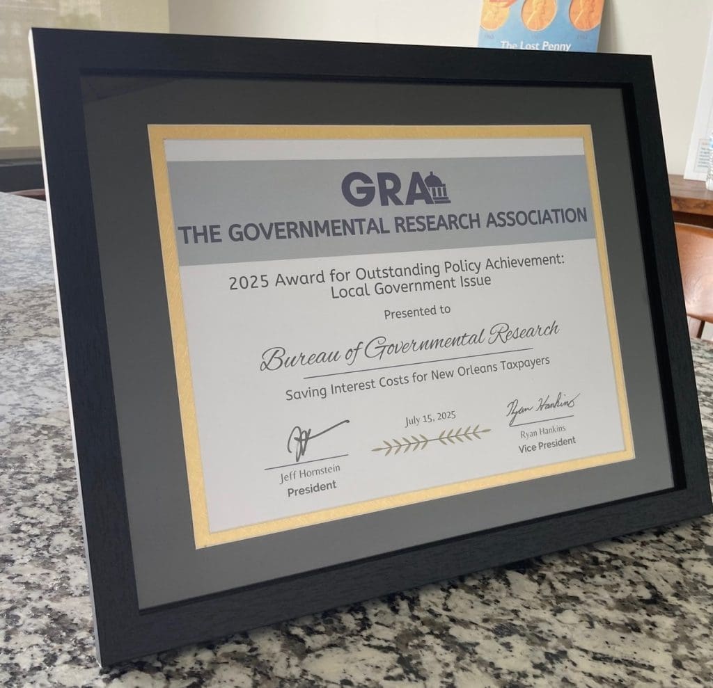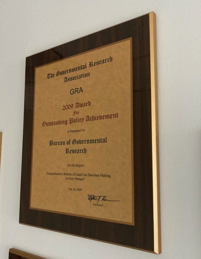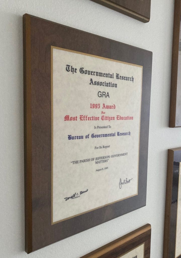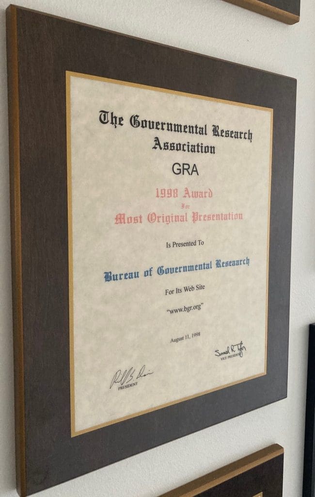 Since 1932, the Bureau of Governmental Research has worked tirelessly to promote good governance and positive outcomes for the public through our research. Over the decades, BGR has won many awards for our work from the Governmental Research Association, the national group of organizations and individuals like BGR who are professionally engaged in public policy, governmental, and civic research.