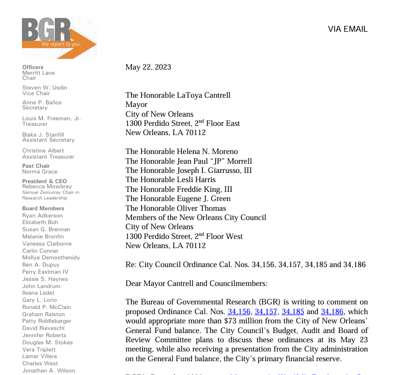 Strengthening New Orleans’ Use of Its General Fund Balance (Letter to Mayor and City Council)