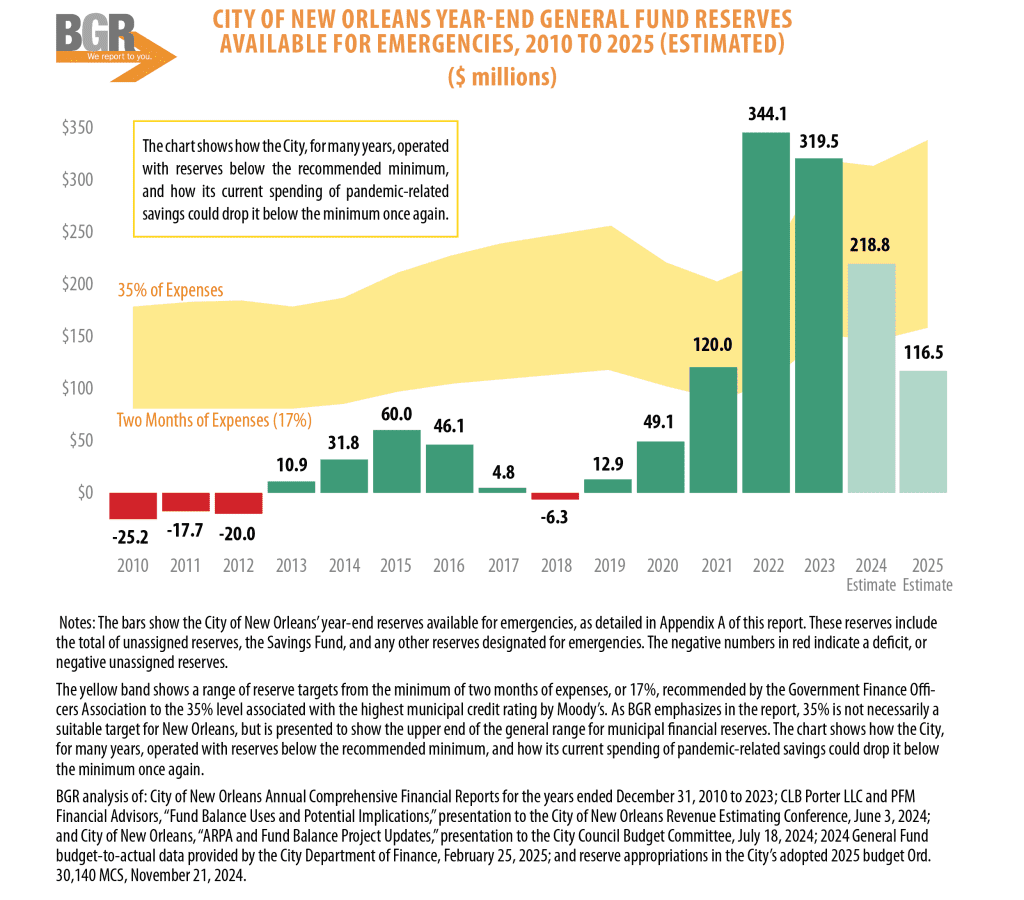 BGR also found fundamental problems with spending projections the administration uses to identify potential budget surpluses or deficits. The erroneous projections delayed by months the discovery of a $42 million deficit in the New Orleans Police Department’s 2024 personnel budget. As a result, the 2025 budget does not include funding to close the gap and is already on pace for another large deficit.