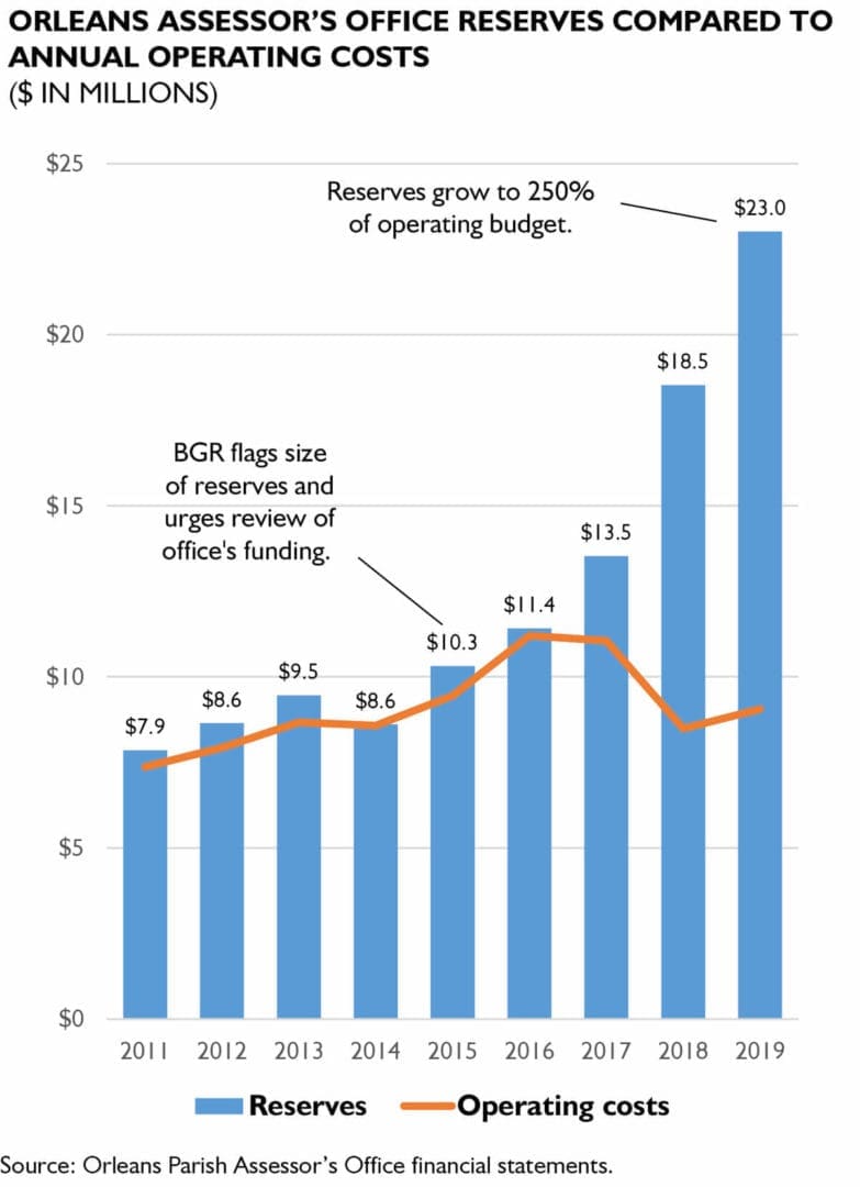 The economic fallout from the ongoing public health crisis has left the City of New Orleans, NOLA Public Schools and other local taxing bodies grappling with significant funding shortfalls. By contrast, the Orleans Parish Assessorâs Office anticipates its 2020 tax revenues will increase by $1 million (about 8%) to $13 million. Moreover, the assessor has accumulated $23 million in reserves, which is more than two-and-a-half times the officeâs annual operating costs. These sizable reserves are linked to a problematic funding formula that BGR has urged policymakers to reevaluate.